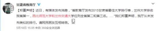 對此,甘肅省教育廳通過官方微博發(fā)布聲明:“我廳從未發(fā)布類似的排行。請網(wǎng)民朋友互相轉(zhuǎn)告。”
