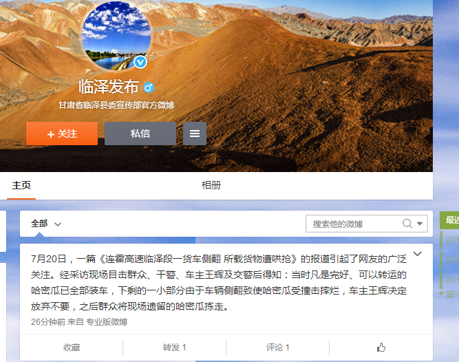 據(jù)臨澤縣委宣傳部消息 7月20日,中國張掖網(wǎng)記者張景初以《一撥就靈:連霍高速臨澤段一貨車側(cè)翻所載貨物遭哄搶》為題,對臨澤縣境內(nèi)高速公路發(fā)生的一起貨車側(cè)翻事故進行了報道,引起了網(wǎng)友的廣泛關(guān)注。現(xiàn)場目擊群眾巖學詩、參與處理事故的新華鎮(zhèn)派出所所長馬德翼、車主王輝及九龍江交警隊大隊長王石勇、民警錢金峰還原了事件全程:
