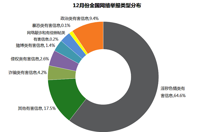 12月份,中國互聯網違法和不良信息舉報中心直接受理、處置網民有效舉報40749件。經核查,會同相關執法部門處置色情、詐騙、賭博網站及鏈接23965條;通知百度、騰訊、360云盤、多玩游戲等網站、搜索引擎服務商、在線存儲工具服務商刪除色情低俗有害信息9063條;通知鳳凰網、豆瓣網、西祠胡同等網站刪除虛假信息3872條,刪除暴恐有害信息869條;通知新浪、騰訊、網易、百度依法處置傳播虛假信息的博客賬號65個、微博賬號83個;通知騰訊依法處置傳播色情低俗信息等違法活動的即時通信賬號831個;通知騰訊微信刪除恐怖分子在廣東等地活動的網絡謠言2001條。