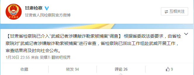 1月30日23時(shí)55分,甘肅省檢察院通過其官方微博,發(fā)布了官方對(duì)于熱議的武威抓記者事件的最新消息,消息稱:根據(jù)省委政法委要求,由省檢察院對(duì)“武威記者涉嫌敲詐勒索被捕案”進(jìn)行審查,省檢察院已派出工作組赴武威開展工作,審查結(jié)果將及時(shí)向社會(huì)公布。