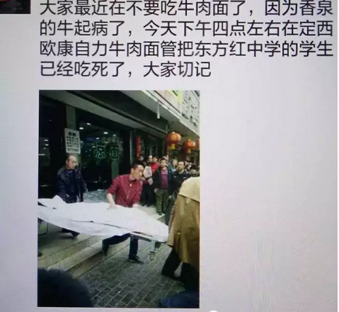 2016年3月20日19時(shí)許,一網(wǎng)民得知安定區(qū)歐康B區(qū)自力牛肉面館有人在吃牛肉面時(shí)死亡,隨即在自己的微信朋友圈發(fā)布“大家最近不要吃牛肉面了,因?yàn)橄闳呐F鸩×耍裉煜挛缢狞c(diǎn)左右在定西歐康自力牛肉面館把東方紅中學(xué)的學(xué)生已經(jīng)吃死了,大家切記”的謠言。該信息內(nèi)容與事實(shí)嚴(yán)重不符,純屬制造謠言擾亂社會(huì)公共秩序。謠言發(fā)布后,迅速引發(fā)了網(wǎng)民熱議。