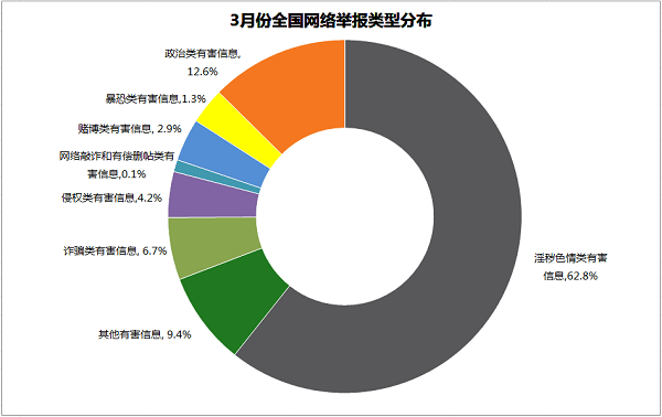 3月份,中國互聯(lián)網(wǎng)違法和不良信息舉報中心直接受理、處置網(wǎng)民有效舉報34976件。經(jīng)核查,會同相關(guān)執(zhí)法部門處置色情、詐騙、賭博網(wǎng)站及鏈接16365條(個);通知新浪微博、鳳凰網(wǎng)、樂視網(wǎng)、好搜、百度等網(wǎng)站、搜索引擎服務(wù)商、在線存儲工具服務(wù)商刪除色情低俗有害信息8323條;通知豆瓣網(wǎng)、西陸網(wǎng)、鐵血網(wǎng)、優(yōu)酷網(wǎng)等網(wǎng)站刪除含有血腥殘忍內(nèi)容,販賣毒藥、槍支的暴恐有害信息1815條;通知新浪、騰訊依法處置傳播虛假信息的博客賬號48個、微博賬號69個;通知騰訊依法處置販賣假幣、違規(guī)出售煙草、發(fā)布招嫖信息等從事違法活動的即時通信賬號710個;通知網(wǎng)易、鳳凰網(wǎng)、人人網(wǎng)、貓撲網(wǎng)、360DOC、寬帶山社區(qū)、東方財富網(wǎng)等網(wǎng)站刪除歪曲黨史國史、捏造京港澳高速油罐車爆炸事故傷亡人數(shù)等虛假信息、網(wǎng)絡(luò)謠言7646條。