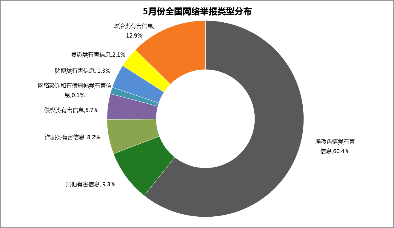 5月份,中國互聯網違法和不良信息舉報中心直接受理、處置網民有效舉報32071件。經核查,會同相關執法部門處置色情、詐騙、賭博網站及鏈接14920條;通知百度貼吧、騰訊、優酷、百度云盤等網站、搜索引擎服務商、在線存儲工具服務商刪除色情低俗有害信息6237條;通知新浪微博、中華網、人人網、360DOC等網站刪除含有血腥殘忍內容、恐怖分子活動、教授槍械使用方法的暴恐有害信息1128條;通知新浪、騰訊、網易等網站依法處置傳播虛假信息的博客賬號58個、微博賬號51個;通知騰訊依法處置從事販賣槍械、發布招嫖信息等違法活動的即時通信賬號896個;通知西祠胡同、鳳凰網、凱迪社區、鐵血網等刪除歪曲黨史國史、宣揚邪教等虛假信息8781條。
