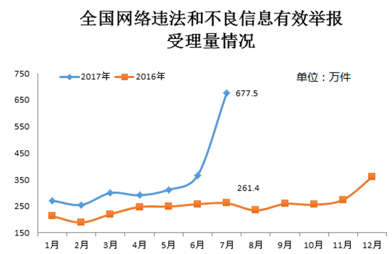 繼上個月之后,7月份全國網絡違法和不良信息有效舉報量再創月度歷史新高,達677.5萬件,環比、同比分別激增約84.7%和1.6倍。同時,全國網絡舉報部門直接處置或向執法部門轉交有效舉報約665.9萬件,通過各類渠道向網民反饋處置結果660.5萬件。