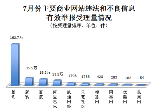 在當月有效舉報中,中國互聯網違法和不良信息舉報中心受理近6.8萬件,環比、同比分別增長約4.3%和39.1%。各地網信辦舉報部門受理約449.6萬件,環比增長兩倍多,同比增長近49倍。全國主要網站受理約221萬件,環比增長約4.6%,同比下降約10.6%。其中,騰訊(微信、QQ、網站舉報專區、騰訊網、騰訊微博)、新浪(新浪微博、新浪網)、百度、阿里巴巴等主要商業網站受理210.7萬件,處置或向執法部門轉交210.7萬件。