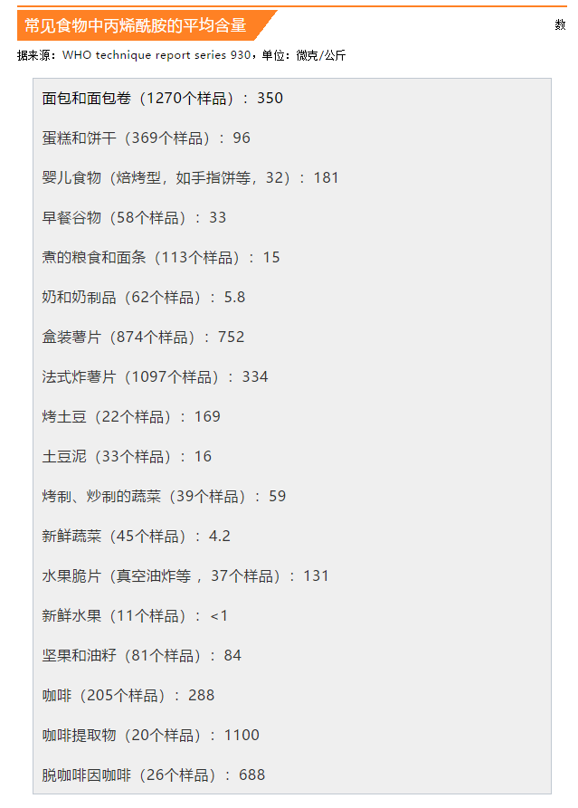 按照世界衛生組織(WHO)的食物污染物工作報告(WHO technique report series 959)中確認的丙烯酰胺攝入量界限值是180微克/公斤體重。按這個數值,一個體重50kg的女性,每天的安全攝入量是9000微克丙烯酰胺。