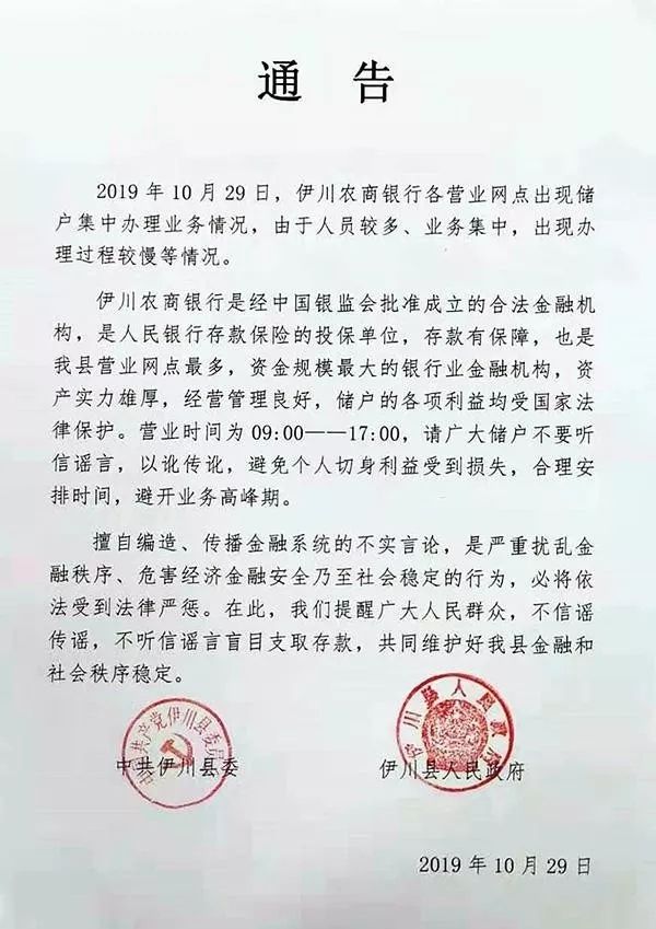 當天下午,伊川縣委縣政府即發布通告辟謠,并提醒儲戶勿聽信謠言,以訛傳訛,避免個人切身利益受到損失。