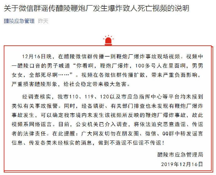 經調查核實,我市110、119、120以及市應急指揮中心等平臺均未接到類似有關事故報警。同時,經各鎮街、有關部門排查也未發現有鞭炮廠爆炸事故發生,可以確定我市境內未發生該視頻所反映的鞭炮廠爆炸事故,故此視頻系網絡謠言。目前,公安機關已介入調查,將依法追究惡意造謠、傳謠者的法律責任。在此提醒:廣大網友切勿在朋友圈、微信、QQ群中轉發謠言信息、傳發各類未經核實的消息,做到不造謠不信謠不傳謠!