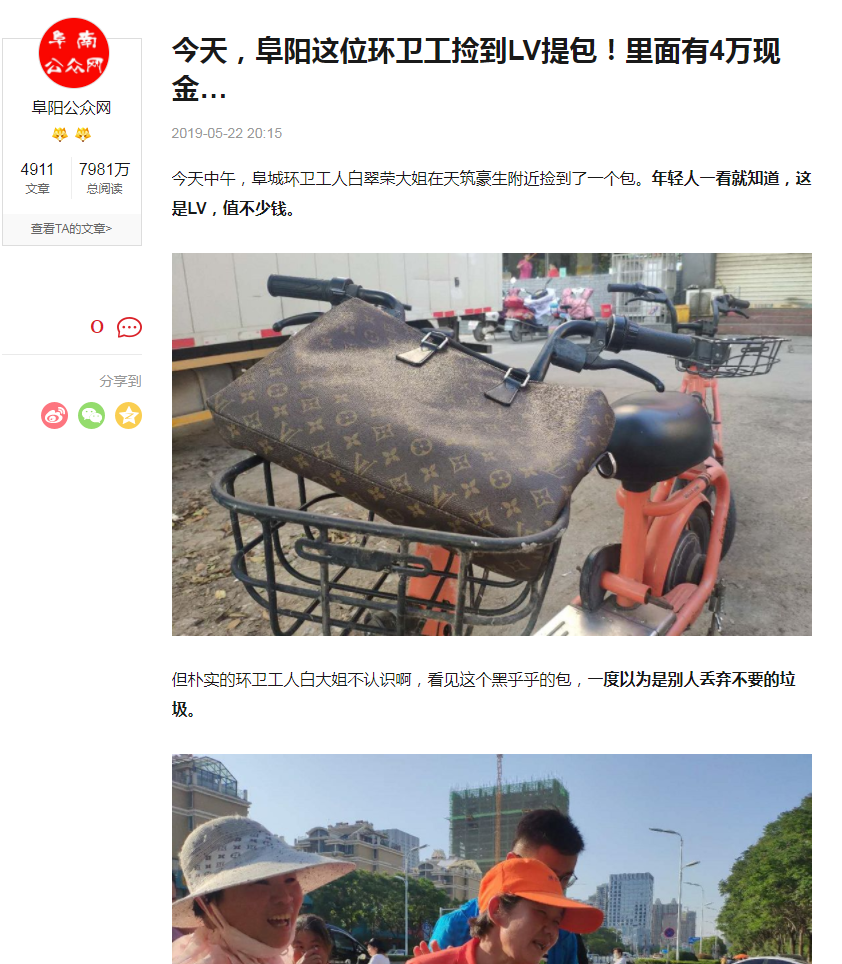 解放日?qǐng)?bào)·上觀新聞?dòng)浾卟樽C發(fā)現(xiàn):“環(huán)衛(wèi)女工撿到裝有四捆百元大鈔名牌包”確有其事,它發(fā)生在今年5月的安徽阜陽(yáng);但是,該事件中并不存在“遭索賠萬(wàn)元”等令人大跌眼鏡的故事情節(jié)。網(wǎng)傳故事是假的,它將一個(gè)拾金不昧的故事結(jié)尾改成了好心人遭索賠。