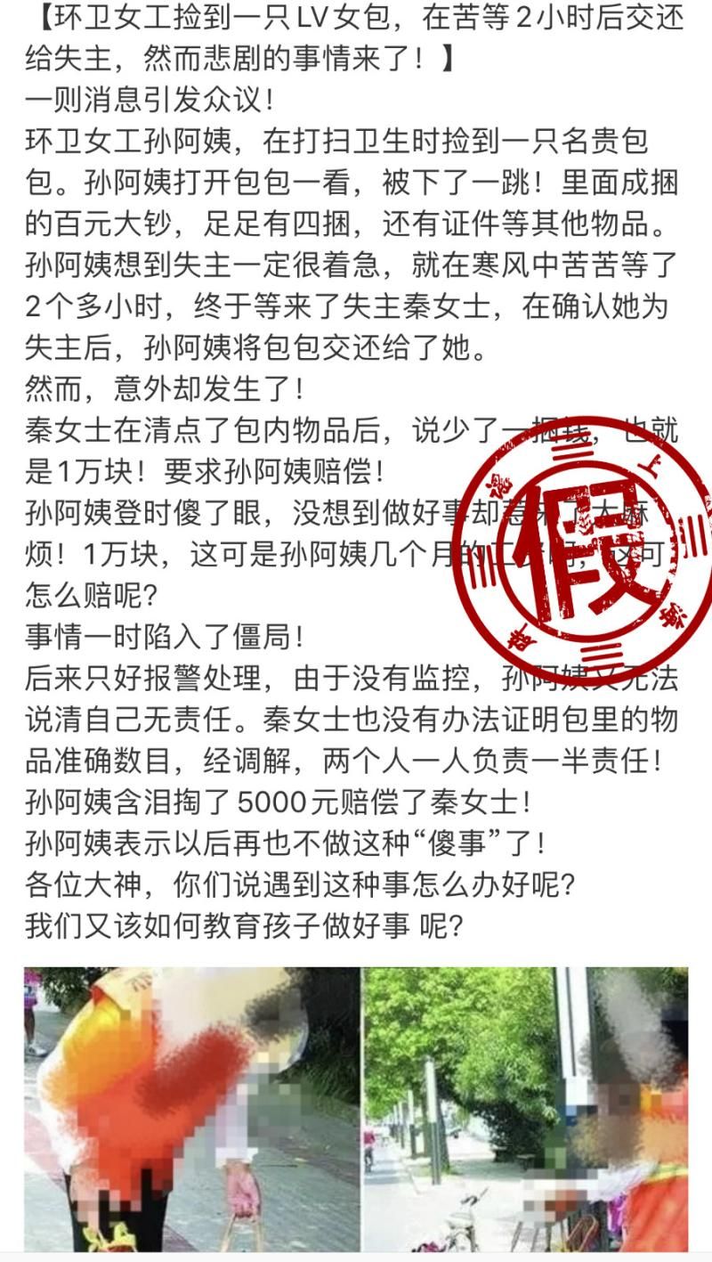 這兩天,一條題為《環(huán)衛(wèi)女工撿到一只LV女包,在苦等2小時(shí)后交還給失主,然而悲劇的事情來(lái)了!》的帖子在網(wǎng)上熱傳。帖子講述了一個(gè)故事:環(huán)衛(wèi)女工孫阿姨撿到一只LV女包,內(nèi)有四捆百元大鈔和證件等物品,孫阿姨在寒風(fēng)中苦等2個(gè)多小時(shí)終于等來(lái)了失主。不料失主卻稱(chēng),百元大鈔本應(yīng)為5捆,包里現(xiàn)在少了一捆整整一萬(wàn)元。報(bào)警調(diào)解后,雙方各負(fù)一半責(zé)任,孫阿姨含淚賠了5000元給失主。而這5000元,正是孫阿姨幾個(gè)月的工資。帖子中還附有一張環(huán)衛(wèi)工人拎著女包的照片。