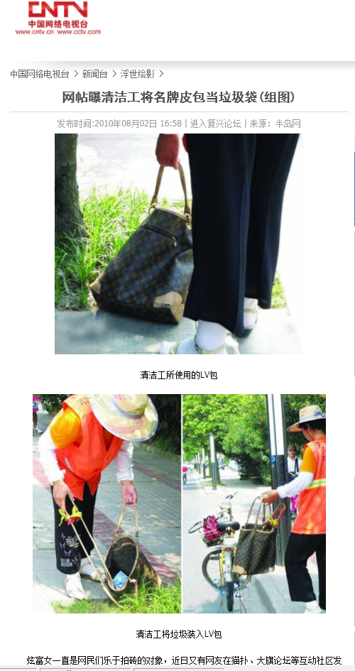 該報(bào)道中通篇沒(méi)有索賠的反轉(zhuǎn)情節(jié)。而且,網(wǎng)傳故事中所配的圖片也是從他處挪用拼接而來(lái)。記者通過(guò)圖片檢索發(fā)現(xiàn),該圖最早出現(xiàn)在2010年某論壇的一個(gè)帖子中,有網(wǎng)友稱(chēng)在街上拍到有清潔工將疑似名牌皮包當(dāng)垃圾袋。