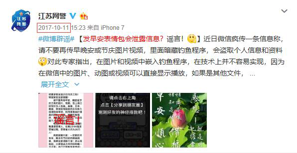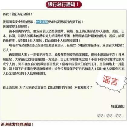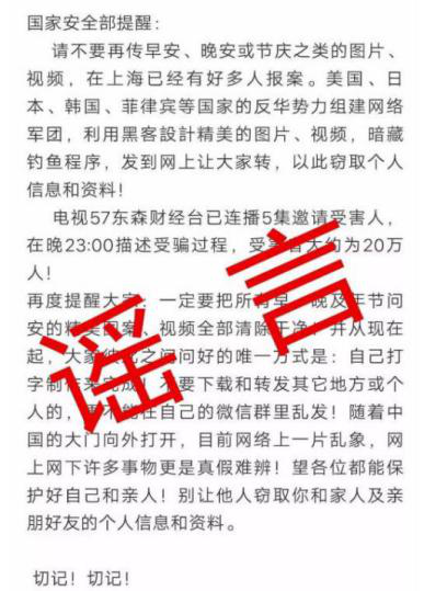 這條“提醒”稱:請(qǐng)不要再傳早安、晚安或節(jié)慶之類的圖片、視頻,在上海已有好多人報(bào)案!國(guó)外的反華勢(shì)力組建網(wǎng)絡(luò)軍團(tuán),利用黑客設(shè)計(jì)精美的圖片、視頻,暗藏釣魚(yú)程序,發(fā)到網(wǎng)上讓大家轉(zhuǎn),竊取個(gè)人信息和資料。