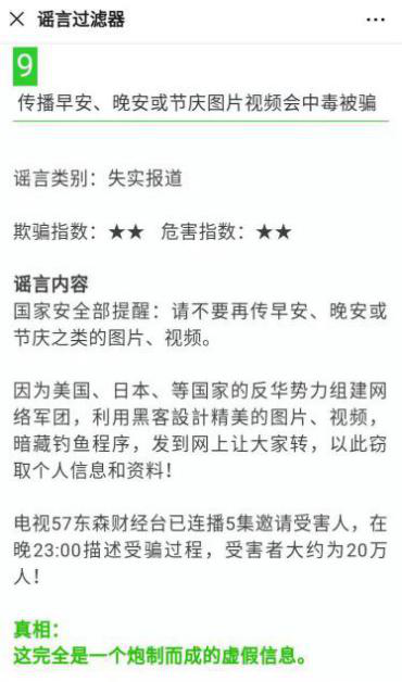 據(jù)媒體報(bào)道,早在2015年,我國(guó)臺(tái)灣地區(qū)就出現(xiàn)了類似謠言。網(wǎng)傳信息中的“東森財(cái)經(jīng)臺(tái)”是臺(tái)灣地區(qū)的一個(gè)電視頻道,該頻道并未播放過(guò)相關(guān)新聞報(bào)道。當(dāng)時(shí),高雄警方已對(duì)此進(jìn)行辟謠,稱網(wǎng)傳信息“請(qǐng)不要再傳早安或節(jié)慶之類的圖片、視頻,已經(jīng)有好多人報(bào)案……”系謠言,網(wǎng)上轉(zhuǎn)發(fā)的問(wèn)候圖片、視頻無(wú)法攜帶病毒,并推測(cè)可能是部分網(wǎng)友不想被此類圖片打擾才散布這些假消息。