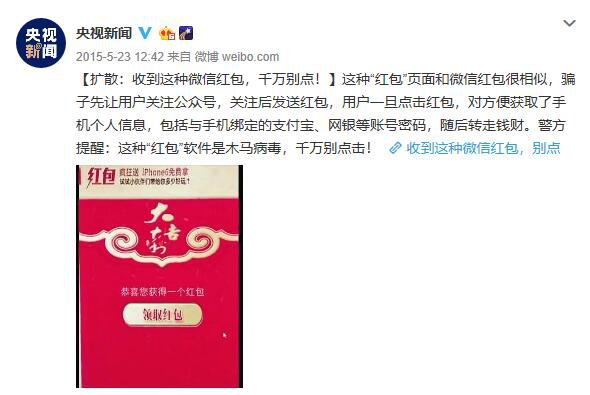 早在2015年,央視新聞就曾以“擴(kuò)散:收到這種微信紅包,千萬(wàn)別點(diǎn)!”為題發(fā)布微博稱,有種“紅包”頁(yè)面和微信紅包很相似,騙子先讓用戶關(guān)注公眾號(hào),關(guān)注后發(fā)送紅包,用戶一旦點(diǎn)擊紅包,對(duì)方便獲取了手機(jī)個(gè)人信息,包括與手機(jī)綁定的支付寶、網(wǎng)銀等賬號(hào)密碼,隨后轉(zhuǎn)走錢財(cái)。
