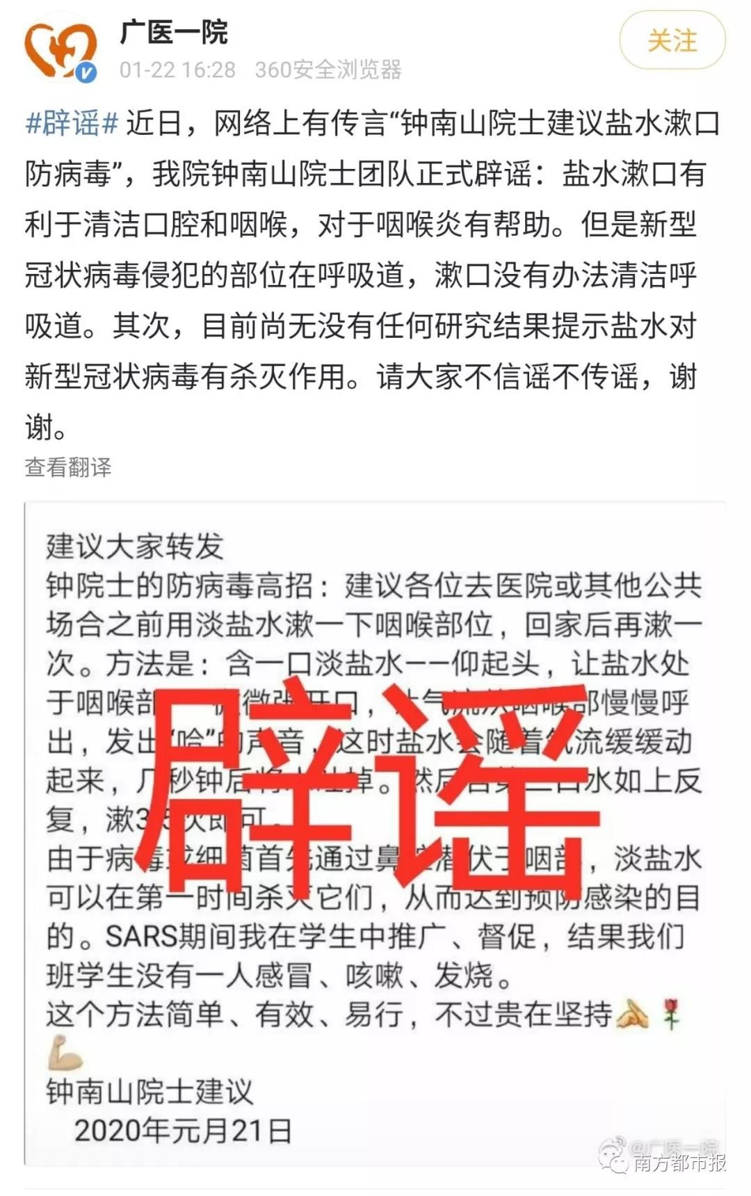 近日,網絡上有傳言“鐘南山院士建議鹽水漱口防病毒”,我院鐘南山院士團隊正式辟謠:鹽水漱口有利于清潔口腔和咽喉,對于咽喉炎有幫助。但是新型冠狀病毒侵犯的部位在呼吸道,漱口沒有辦法清潔呼吸道。其次,目前尚無沒有任何研究結果提示鹽水對新型冠狀病毒有殺滅作用。請大家不信謠不傳謠,謝謝。