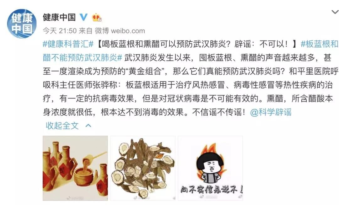 前晚(1月21日),國家健康委員會官方微博@健康中國 對于喝板藍根、熏醋可以預防武漢肺炎的說法緊急辟謠。