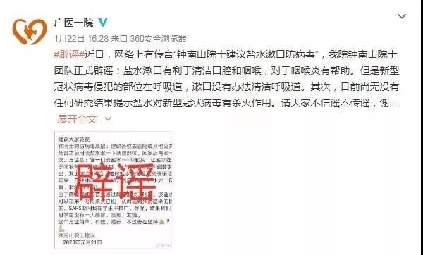 據廣州醫科大學附屬第一醫院官方微博消息,近日,網絡上有傳言“鐘南山院士建議鹽水漱口防病毒”,我院鐘南山院士團隊正式辟謠: