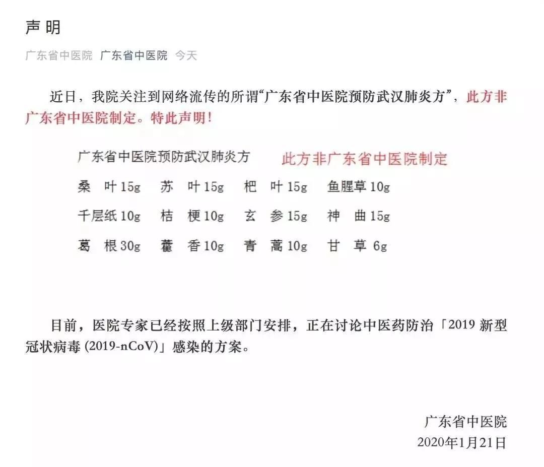 21日下午,廣東省中醫院在官方微信發布聲明辟謠,稱此方非廣東省中醫院制定。