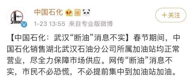 23日,中國石化官方微博發布消息稱,春節期間,中國石化銷售湖北武漢石油分公司所屬加油站均正常營業,盡全力保障市場供應。網傳“斷油”消息不實,市民不必恐慌,不必提前集中到加油站加油。