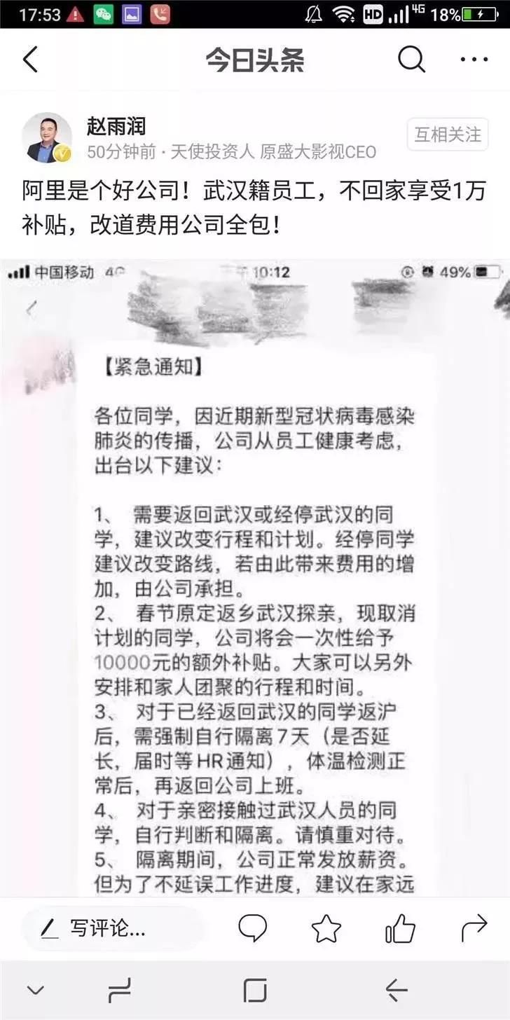 22日,社交媒體賬號名為趙雨潤,認證為“天使投資人,原盛大影視CEO”發布一張截圖被外界關注。截圖通知上寫明,上海地區的武漢籍員工若取消原定反鄉探親計劃,一次性給予10000元的額外補貼。趙雨潤透露,“阿里是個好公司!武漢籍員工,不回家享受1萬補貼,改道費用公司全包。”