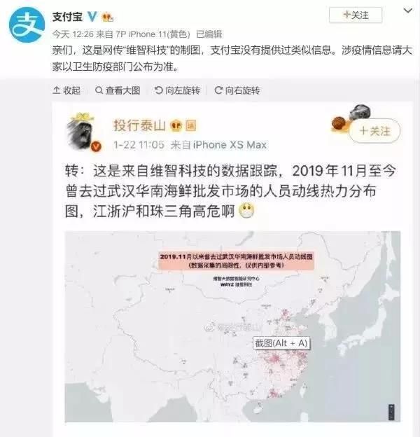 22日中午,支付寶官方微博公開辟謠:“這是網傳‘維智科技’的制圖,支付寶沒有提供過類似信息。涉疫情信息請大家以衛生防疫部門公布為準。”