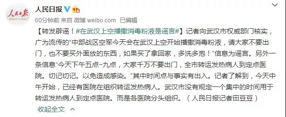 謠言三:“在武漢上空開始播撒消毒粉液”