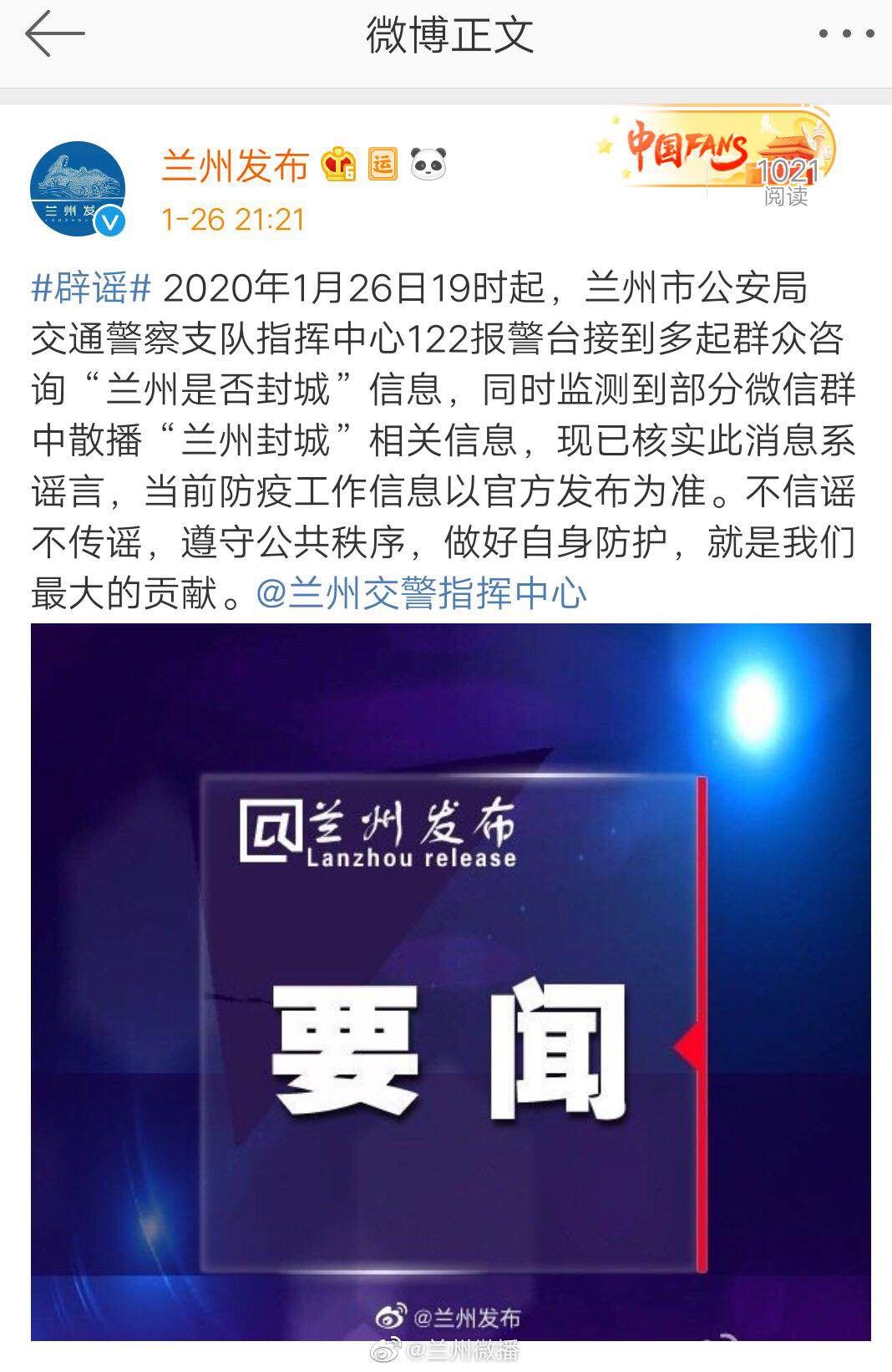 2020年1月26日19時(shí)起,蘭州市公安局交通警察支隊(duì)指揮中心122報(bào)警臺接到多起群眾咨詢“蘭州是否封城”信息,同時(shí)監(jiān)測到部分微信群中散播“蘭州封城”相關(guān)信息,現(xiàn)已核實(shí)此消息系謠言,當(dāng)前防疫工作信息以官方發(fā)布為準(zhǔn)。不信謠不傳謠,遵守公共秩序,做好自身防護(hù),就是我們最大的貢獻(xiàn)。