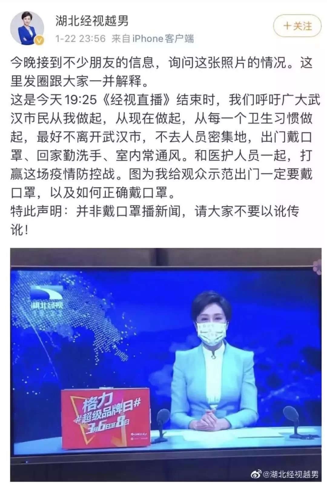 1月22日,有網友發現,湖北經視、湖北公共新聞頻道的多位主持人、記者在播報中戴上了口罩。有人感嘆“電視史上第一次”,還有人表示此舉可以為觀眾提供更好的公共衛生示范。