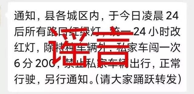 謠言三:“所有路口紅綠燈統(tǒng)一改紅燈”“禁止私家車(chē)輛出行”。