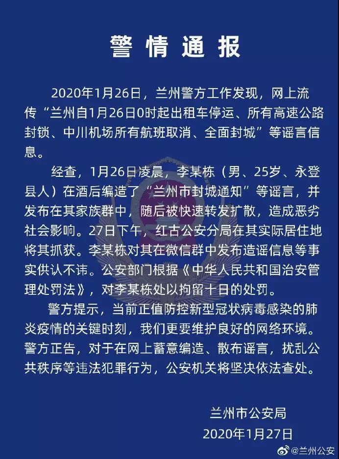 經(jīng)蘭州市公安局核查,系李某棟在酒后編造了“蘭州市封城通知”等謠言,并發(fā)布在其家族群中,隨后被快速轉(zhuǎn)發(fā)擴散,造成惡劣社會影響。公安機關(guān)對違法行為人處以拘留十日的處罰。