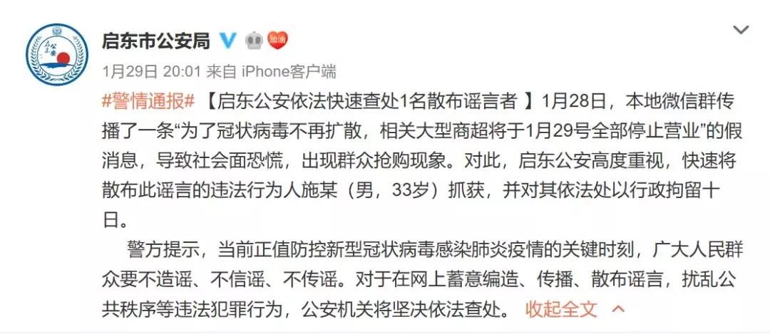 據(jù)江蘇省啟東市公安局微博1月29日消息,啟東公安局對網(wǎng)傳消息高度重視,快速將散布此謠言的違法行為人施某抓獲,并對其依法處以行政拘留十日。