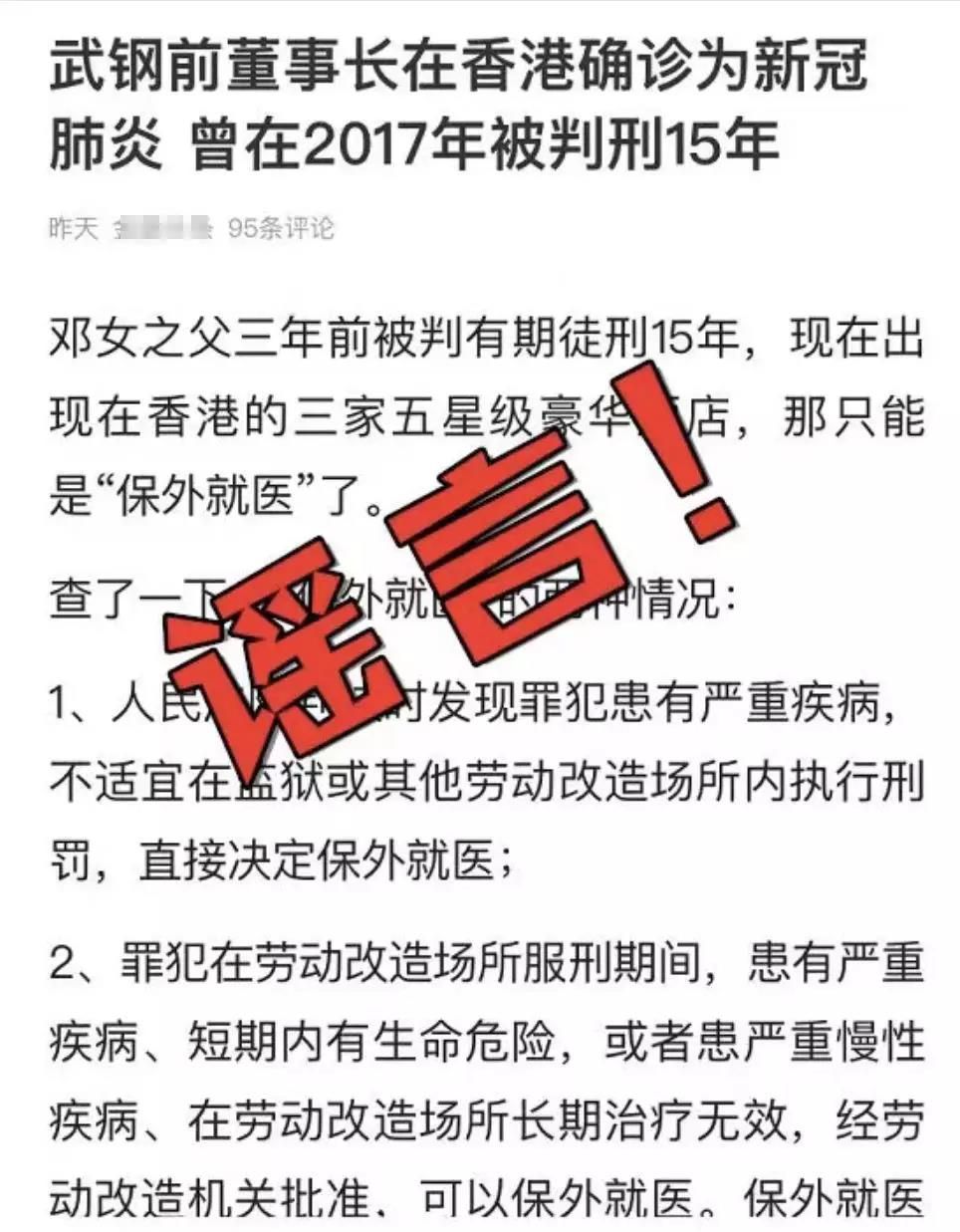 謠言二:武鋼前董事長保外就醫在港染新冠肺炎