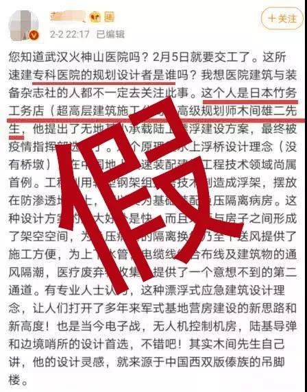 經查證,日本并無此人,也不存在“竹務工務店”。火神山醫院的設計者是2003年SARS疫情時期北京“小湯山醫院”的總設計師、中國中元顧問首席總建筑師黃錫璆。