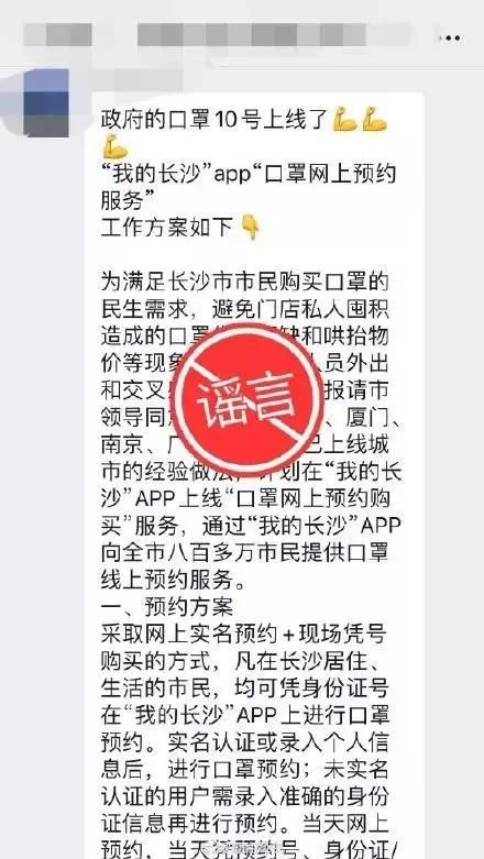 真相:該消息不屬實。這是一則看似較為“完善”的服務方案,打著長沙市政府的旗號,把預約規則、操作步驟、責任分工等說得清清楚楚,讓不少網友信以為真。經了解,“我的長沙”APP上并未公布該方案,也沒有相關預約入口, 通過致電12345長沙市民服務熱線獲悉,長沙市政府并未出臺相關方案,“我的長沙”APP也從未接到任何口罩預約服務的有關通知。