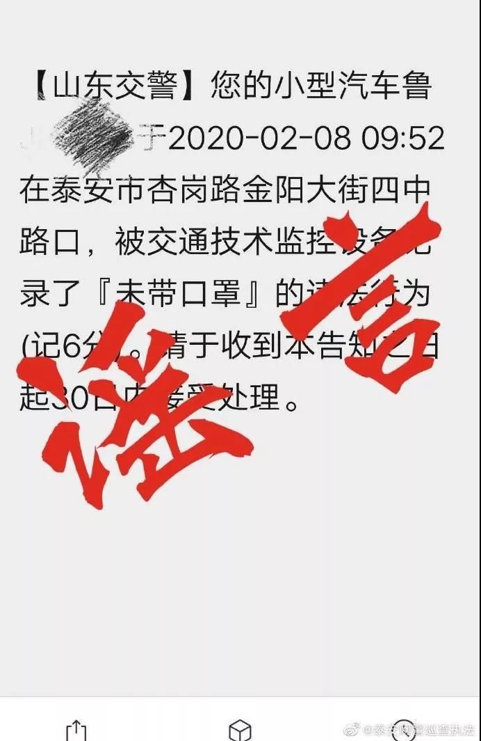 近日,一張“道路交通違法告知短信”的截圖在網上流傳,內容顯示為“【山東交警】您的小型汽車魯JXXXXX于2020-02-08 09:52在泰安市杏崗路金陽大街四中路口,被交通技術監控設備記錄了[未帶口罩]的違法行為(記6分)。請于收到本告知之日起30日內接受處理。”