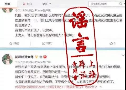 2月9日,多條微博用戶“@樹屋建造大師”的言論截圖在網上流傳。其稱,上海支援武漢第三醫院的醫療隊不僅沒有減輕武漢醫院的負擔,反而要求武漢醫生排雙班,自帶物資也不分給武漢醫生,讓武漢醫生怕了。消息在流傳時,引發大量網友關注和激烈討論。