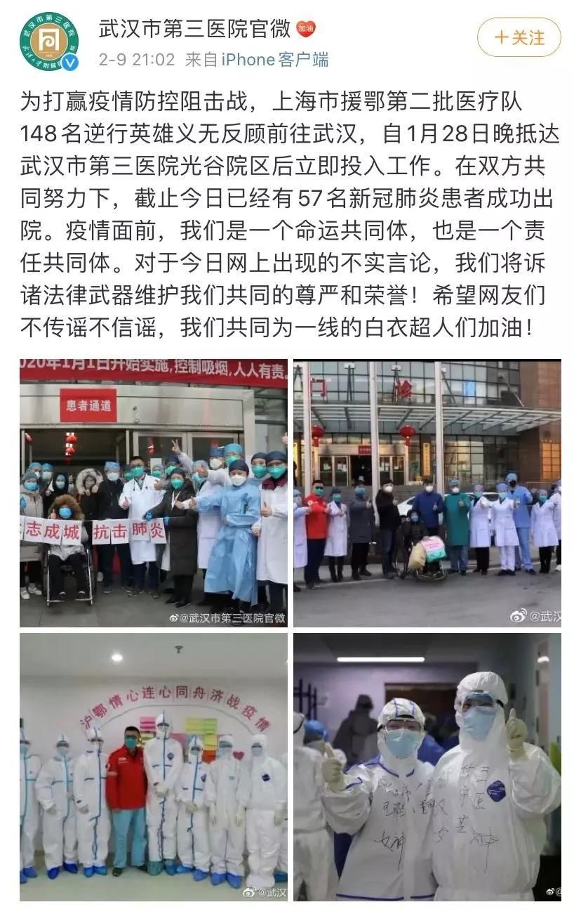 真相:系謠言。2月9日晚,@武漢市第三醫院官微 發布信息稱:“上海市支援湖北第二批醫療隊148名逆行英雄義無反顧前往武漢,自1月28日晚抵達武漢市第三醫院光谷院區后立即投入工作。在雙方共同努力下,截止今日已經有57名新冠肺炎患者成功出院。疫情面前,我們是一個命運共同體,也是一個責任共同體。對于今日網上出現的不實言論,我們將訴諸法律武器維護我們共同的尊嚴和榮譽!”