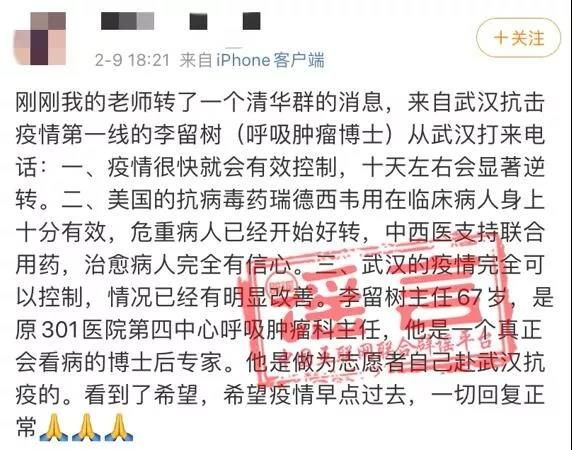 近日,一條轉自清華群的消息在網絡上流傳,稱身處武漢抗擊疫情第一線李留樹(呼吸腫瘤博士)打來電話,表示疫情很快就會控制,抗病毒藥瑞德西韋十分有效等,并附有李留樹的年齡、相關履歷信息。