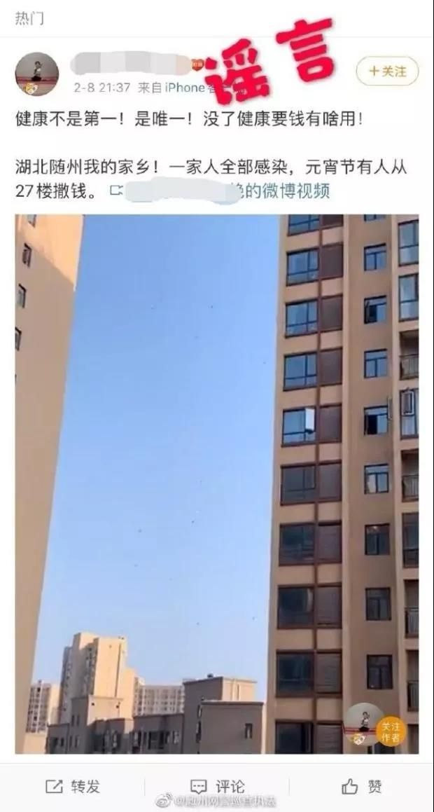 近日,一則關于“一家人全部感染,元宵節從27樓撒錢”的短視頻在朋友圈流傳,不少網友信以為真。2月9日,該視頻被鄭州的不少網友轉發,稱此事發生在鄭州某小區。搜索發現,該視頻幾日前也曾以同樣形式出現在湖北隨州市民的朋友圈里。