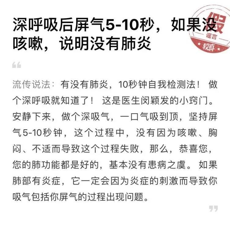 近日,網上流傳著一個通過深呼吸憋氣十秒鐘進行自我健康檢測的方法,憋氣過程中如果沒有咳嗽,則說明沒有肺炎。