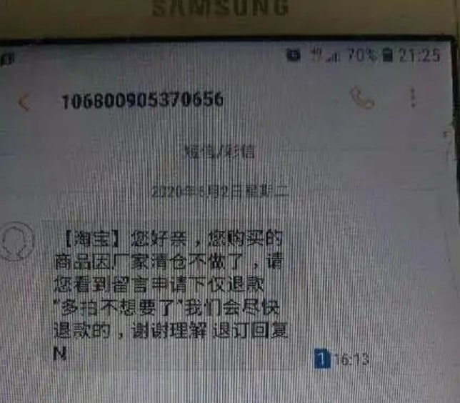 還有一些網(wǎng)友在直播購(gòu)物后,就收到店家清倉(cāng)不做了,要求顧客退款的詐騙短信。