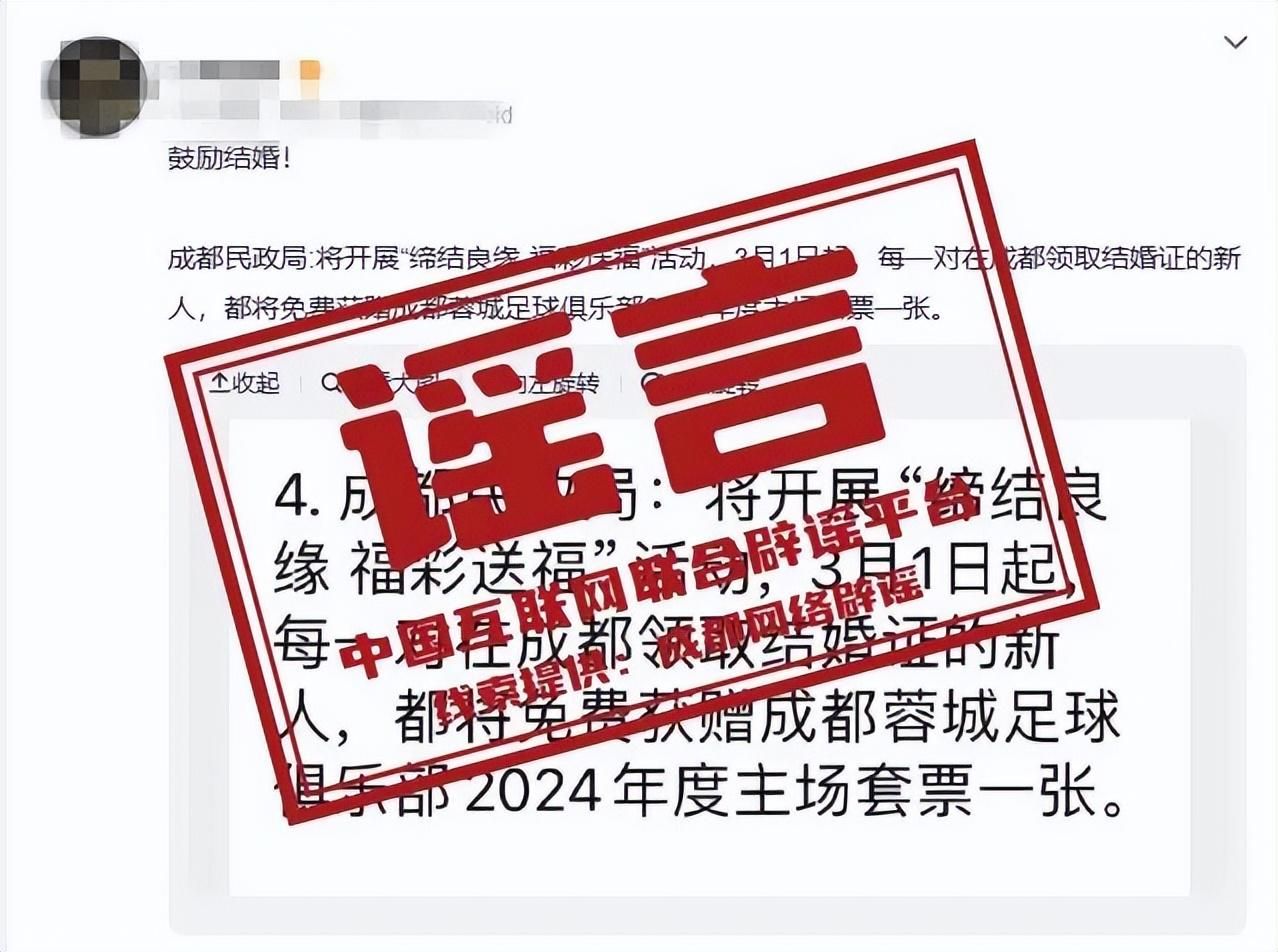真相:近日,有成都網民發帖稱成都市民政局將采取措施鼓勵市民結婚。帖文稱“成都市民政局將于3月1日起開展‘締結良緣 福彩送福’活動,每一對在成都領取結婚證的新人,都將免費獲贈成都蓉城足球俱樂部2024年度主場套票一張。”對此,成都市民政局官方微博辟謠稱,該內容不屬實,成都市沒有開展相關活動。(來源:“成都網絡辟謠”微信公眾號)