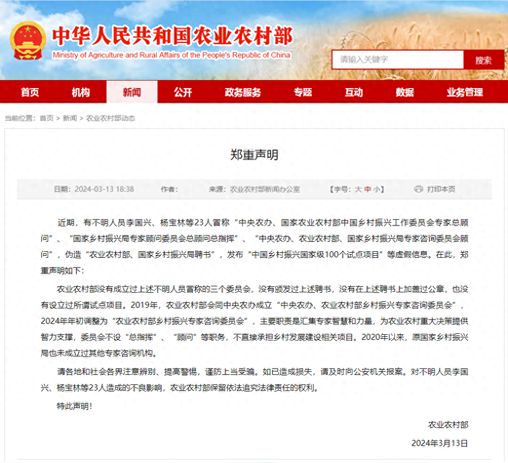 近期,有不明人員李國興、楊寶林等23人冒稱“中央農辦、國家農業農村部中國鄉村振興工作委員會專家總顧問”、“國家鄉村振興局專家顧問委員會總顧問總指揮”、“中央農辦、農業農村部、國家鄉村振興局專家咨詢委員會顧問”,偽造“農業農村部、國家鄉村振興局聘書”,發布“中國鄉村振興國家級100個試點項目”等虛假信息。在此,鄭重聲明如下: