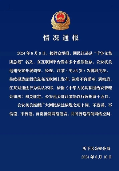 2024年8月9日,接群眾舉報(bào),網(wǎng)民江某以“千字文集團(tuán)總裁”名義,在互聯(lián)網(wǎng)平臺(tái)發(fā)布多個(gè)虛假信息,公安機(jī)關(guān)迅速受案開(kāi)展調(diào)查。經(jīng)查,江某(男,36歲)為博取關(guān)注持續(xù)捏造虛假信息在互聯(lián)網(wǎng)上發(fā)布,造成不良影響。到案后江某對(duì)違法行為供認(rèn)不諱。依據(jù)《中華人民共和國(guó)治安管理處罰法》相關(guān)規(guī)定,公安機(jī)關(guān)對(duì)江某處以行政拘留十五日。