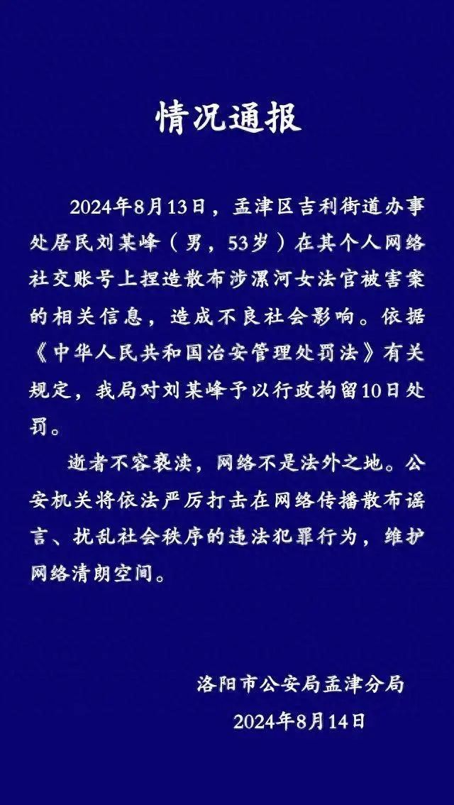 8月13日,孟津區吉利街道辦事處居民劉某峰(男,53歲)在其個人網絡社交賬號上捏造散布涉漯河女法官被害案的相關信息,造成不良社會影響。