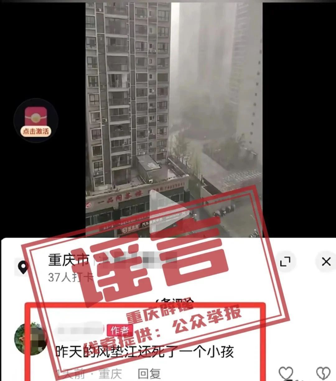 經向警方核實,9月5日,墊江突發強對流天氣,多個街道短時降雨量達50mm以上。陳某將拍攝的現場視頻上配上道聽途說傳言,編造“強對流天氣致一小孩死亡”謠言。目前,重慶墊江警方已依法對陳某予以行政處罰。
