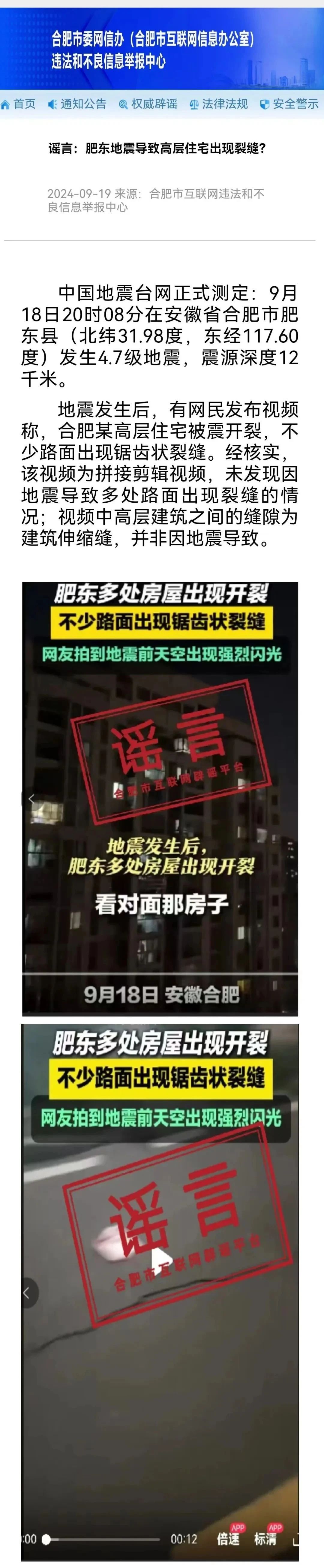 地震發生后,有網民發布視頻稱,合肥某高層住宅被震開裂,不少路面出現鋸齒狀裂縫。經合肥市互聯網違法和不良信息舉報中心核實,該視頻為拼接剪輯視頻,未發現因地震導致多處路面出現裂縫的情況;視頻中高層建筑之間的縫隙為建筑伸縮縫,并非因地震導致。