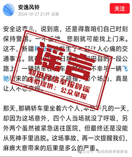 經和田縣應急管理局證實,10月27日和田縣境內未發生交通事故,上述網民發布內容與實際不符,純屬謠言。