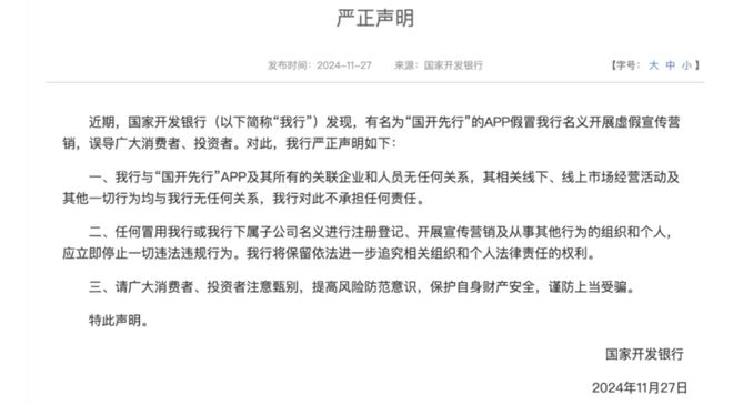 詳情:近期,有名為“國開先行”的APP假冒國家開發銀行名義開展虛假宣傳營銷,誤導廣大消費者、投資者。對此,國家開發銀行于11月27日在官網發布《嚴正聲明》: