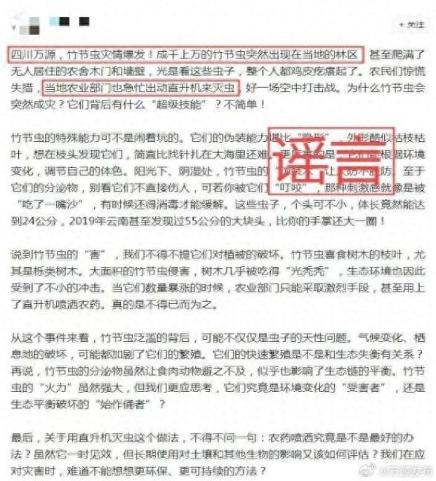 近日,網上出現“四川萬源,竹節蟲災情爆發”的信息,并稱當地農業部門也急忙出動直升機來滅蟲。萬源市委網信辦第一時間轉交萬源市林業局調查核實,經核查,該信息為謠言。萬源市當地林區未出現成千上萬的竹節蟲,萬源市農業部門也未出動直升機來滅蟲,請廣大網民不信謠、不傳謠。
